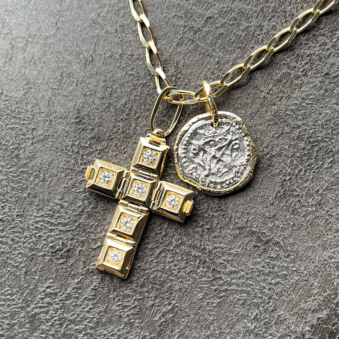 緻密なスタッズ柄が刻まれたキューブ状のペンダントトップが展開しクロス(十字架)にトランスフォームする構造。内側には約0.8ctのダイヤモンドが煌めく。スタッズ柄のクロス型TOPとしても楽しめる3WAY仕様。