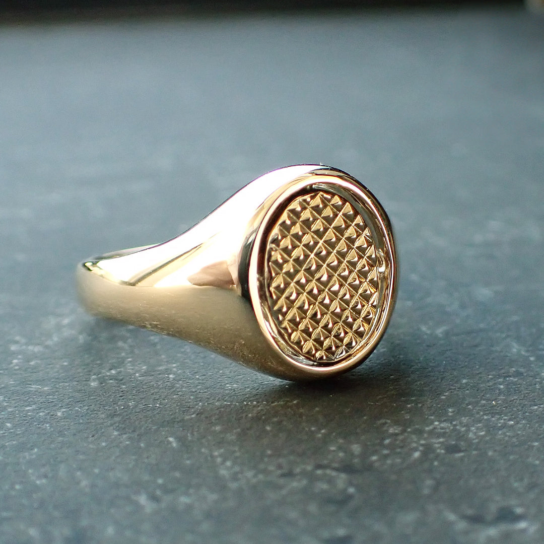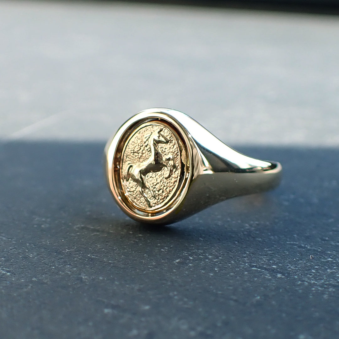 ラッキーモチーフでもあるホースが彫り込まれたインタリオリング。トップが回転する構造で、裏面は反骨精神あふれるスタッズ柄。「成功」「開運」などのポジティブなイメージ×スタッズという組み合わせも面白い。