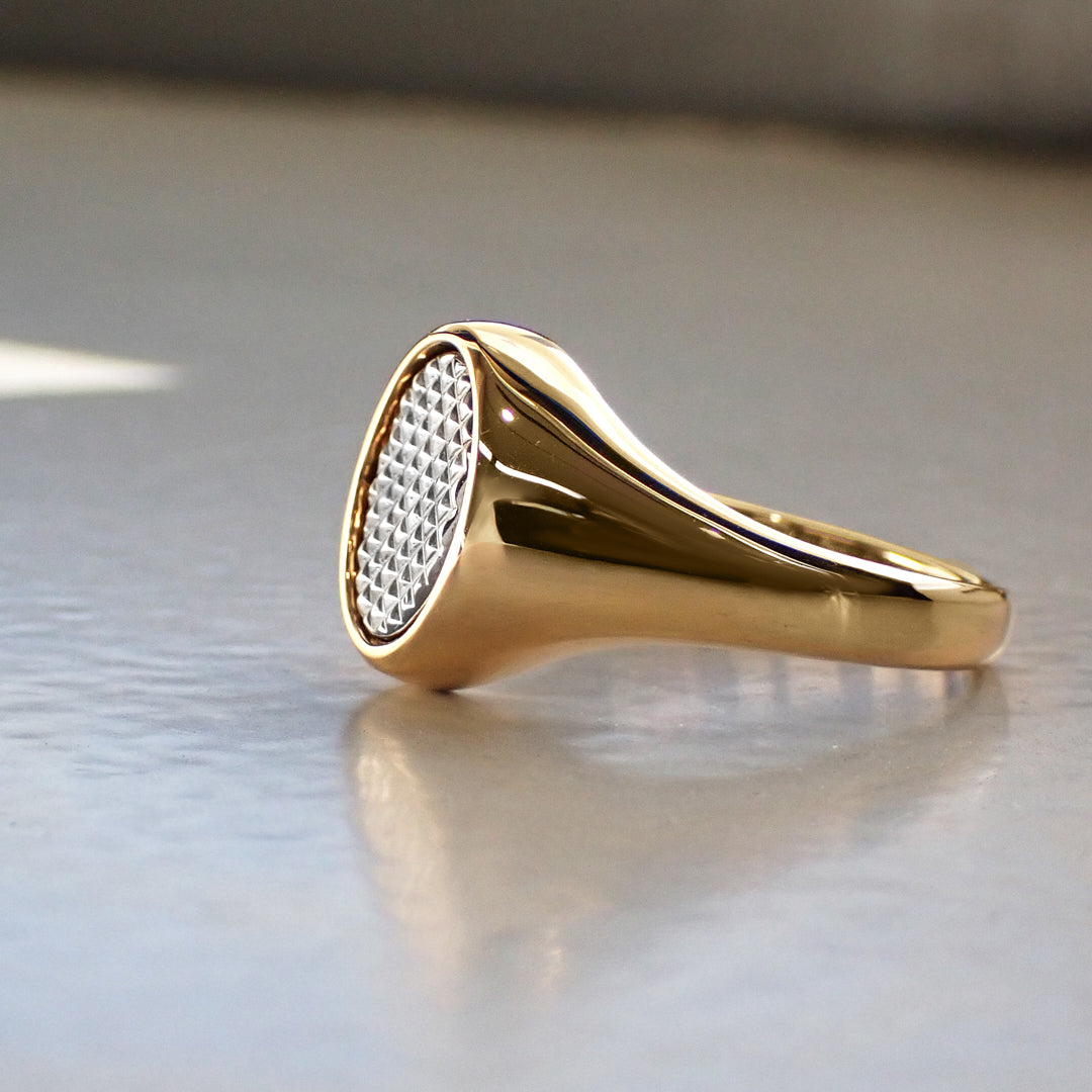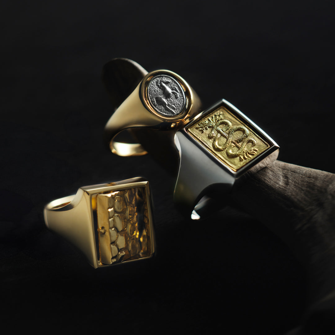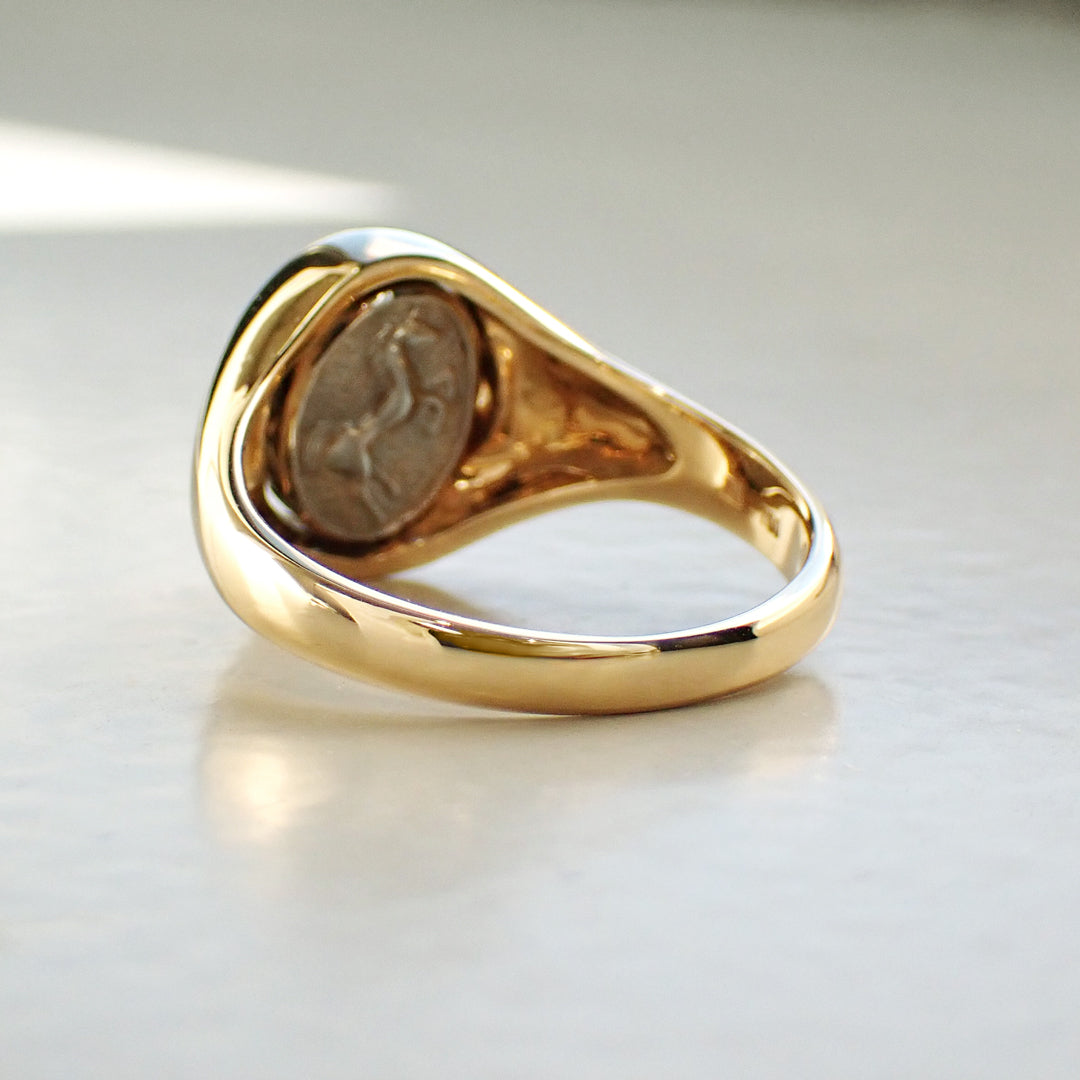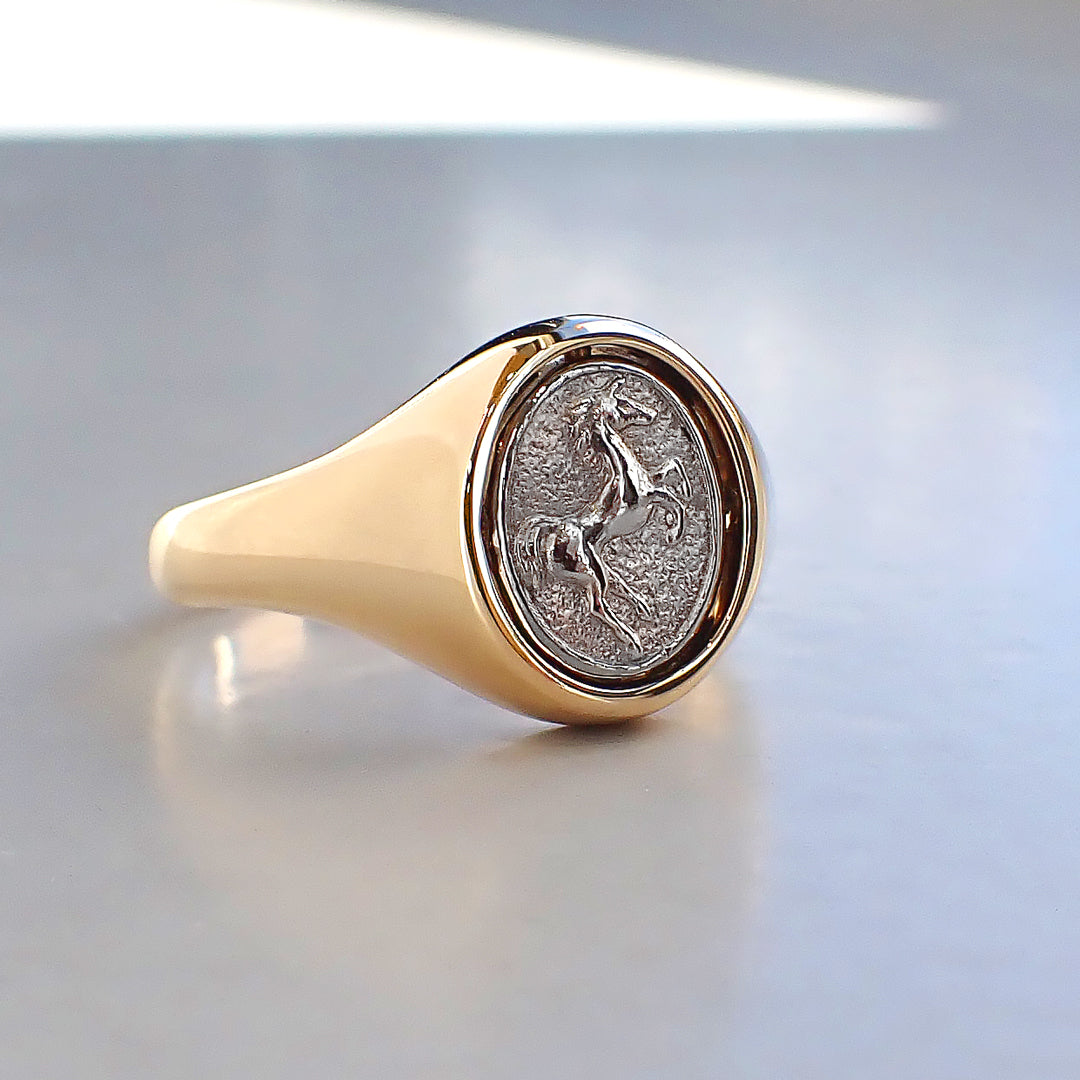 ラッキーモチーフでもあるホースが彫り込まれたインタリオリング。トップが回転する構造で、裏面は反骨精神あふれるスタッズ柄。「成功」「開運」などのポジティブなイメージ×スタッズという組み合わせも面白い。