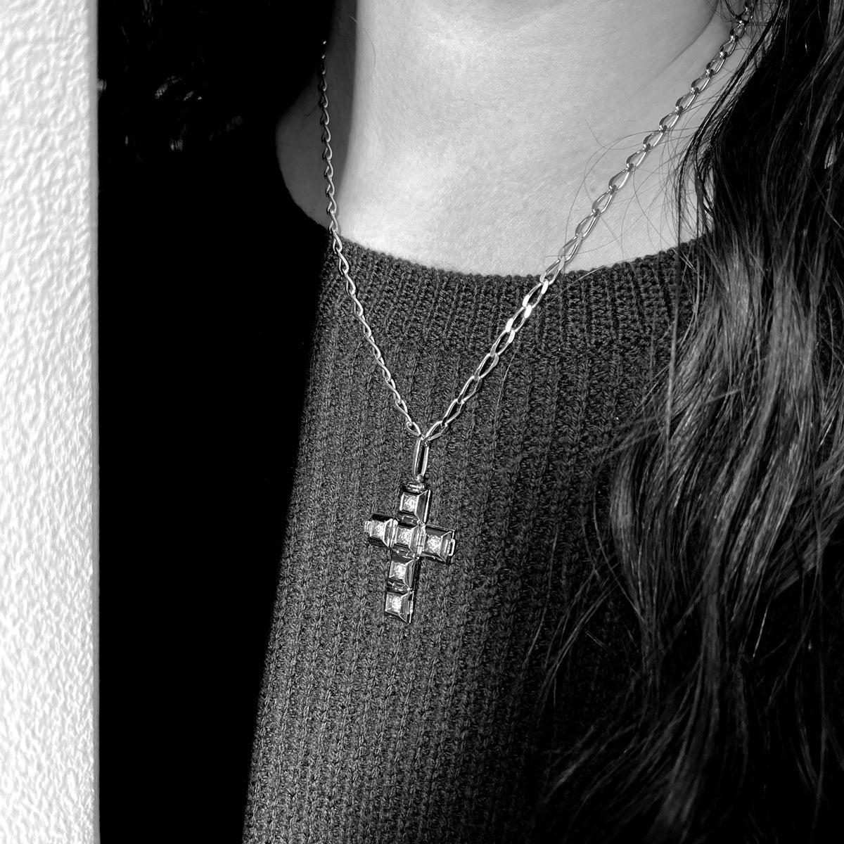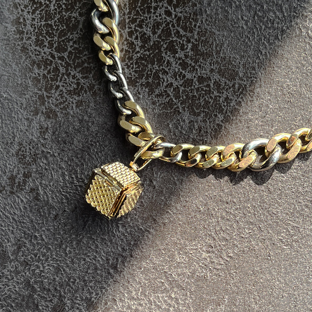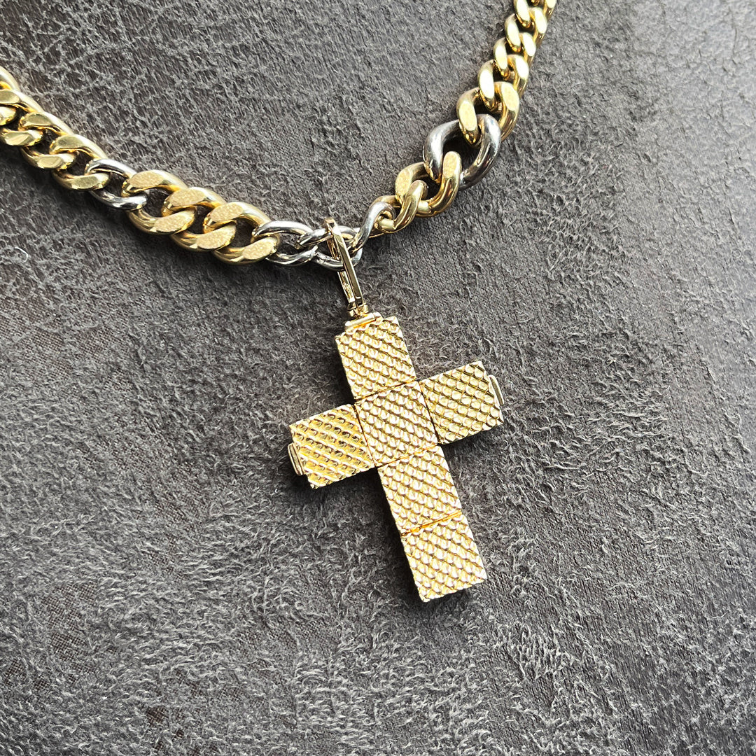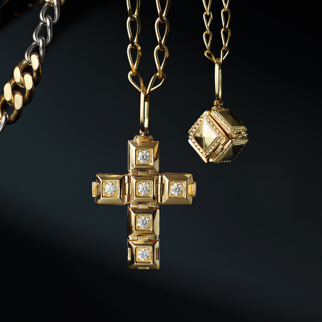 パイソン柄が施されたキューブ状のペンダントトップが展開しクロス(十字架)にトランスフォームする構造。内側には約0.8ctのダイヤモンドが煌めく。スタッズ柄のクロス型TOPとしても楽しめる3WAY仕様。