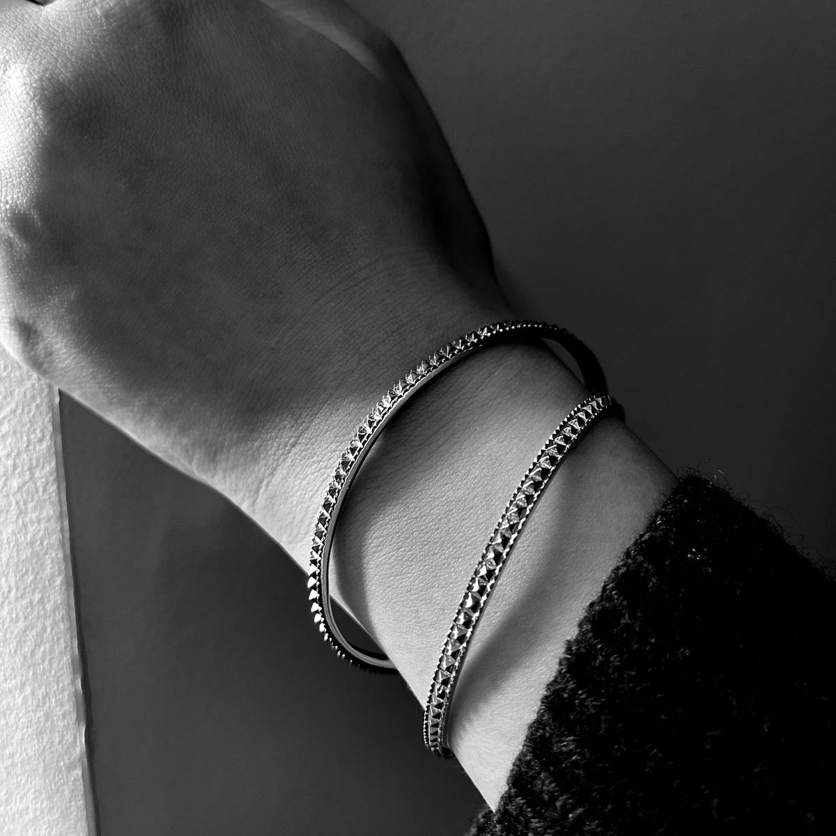 反骨精神のモチーフであるスタッズ。バングルの上下をミル打ち風に仕上げ繊細さをプラス。スタッズの荒々しさを削ぎ落とし緻密に作り上げたジュエリー。うちに秘めた力強さを表現しました。